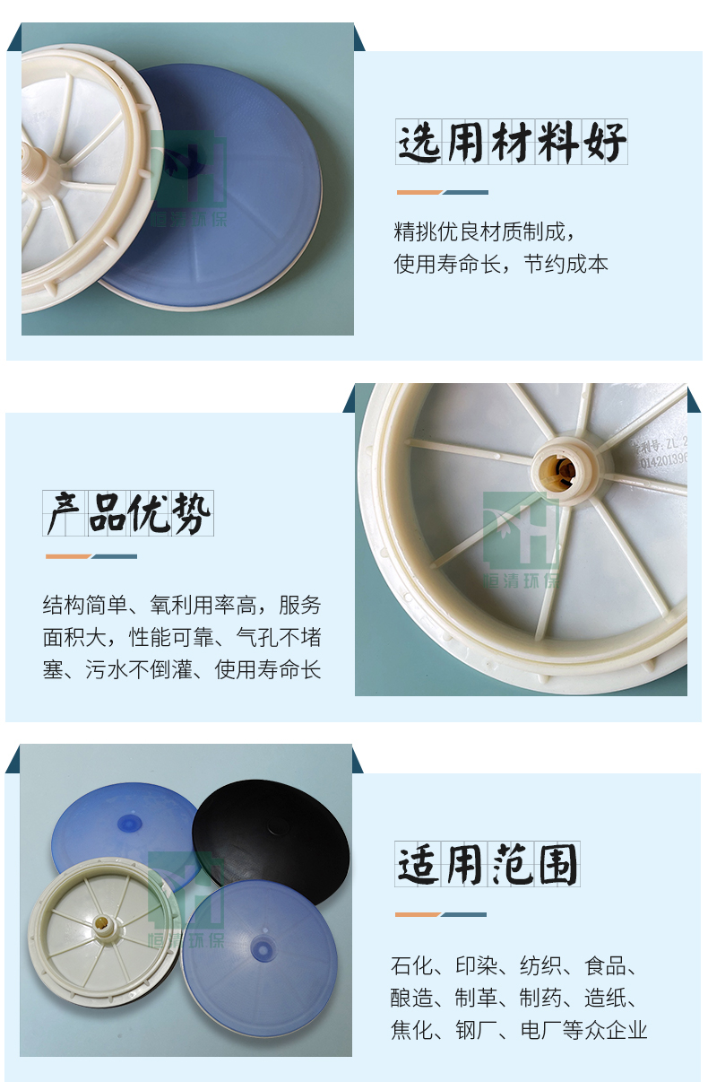 可變微孔曝氣器設(shè)計成略凸起拱形面,采用ABS工程塑料為主體。膜片具有抗附著表面的進口橡膠(EPDM),通過特殊加工制成,膜片開孔選用德進口數(shù)控刀開孔,保證了孔的質(zhì)量和精度。曝氣器在充氧曝氣時,主體盤面設(shè)計了四條送氣槽,使進入的空氣通過止回閥緩沖后直接送至曝氣頭*保證膜片一次性低阻力輕松打開。膜片采用羅紋反鎖機械化裝配,確保膜片脫落。進氣時布?xì)饽ど衔⒖鬃孕泄拿浢涢_,確保空氣通過。在停止曝氣時,布?xì)饽ど系目勺兾⒖壮史忾]狀態(tài),由于布?xì)饽さ目勺兾⒖鬃孕袛U張和收縮,避免經(jīng)往曝氣器微孔受堵現(xiàn)象。其次在曝氣器的底盤設(shè)有止回閥裝置,當(dāng)管道系統(tǒng)停止供氣時阻止混合液進入布?xì)庵Ч埽@樣可避免支管內(nèi)進入混合液而被堵塞。進入的空氣不需特殊過濾,間歇曝氣均不堵塞,并對可變微孔曝氣器類普遍出現(xiàn)的布?xì)鈿饽ひ状的に毫押痛虿婚_膜片或膜片受堵現(xiàn)象作很大的技術(shù)改進。