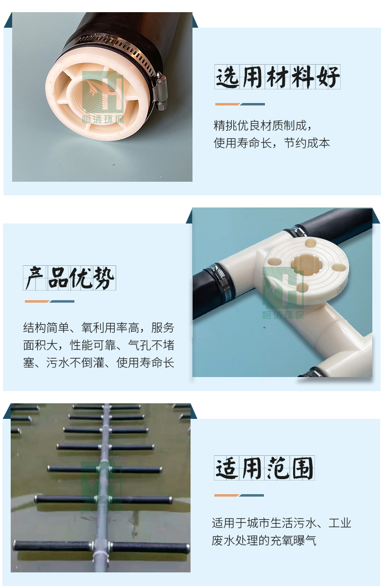 2、全部采用抗腐蝕材料,且抗碰撞能力強,不易損壞,可防止大顆粒泥沙沉積,并可去除部分有機物,曝氣時曝氣器產生左右擺動,可清除池底沉積污泥,避免了死區現象。