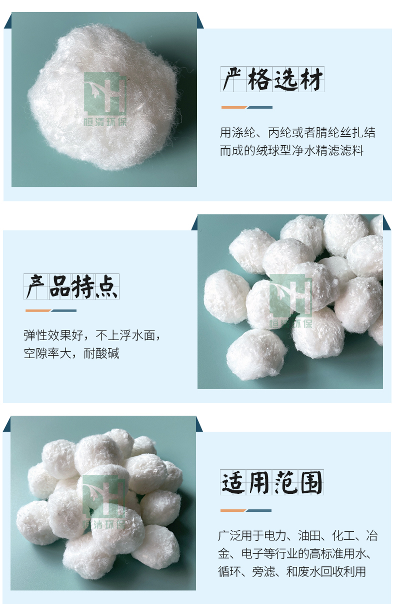 纖維球濾料是由纖維絲扎結而成的,它與傳統的鋼性顆粒濾料相比,彈性效果好,不上浮水面,空隙率大,耐酸堿等優點;在過濾過程中,濾層空隙沿水流方向逐漸變小,比較符合理想濾料由上大下小的空隙分布,效率高、濾速快、截污能力大,可再生,適用于各種水質的過濾。
