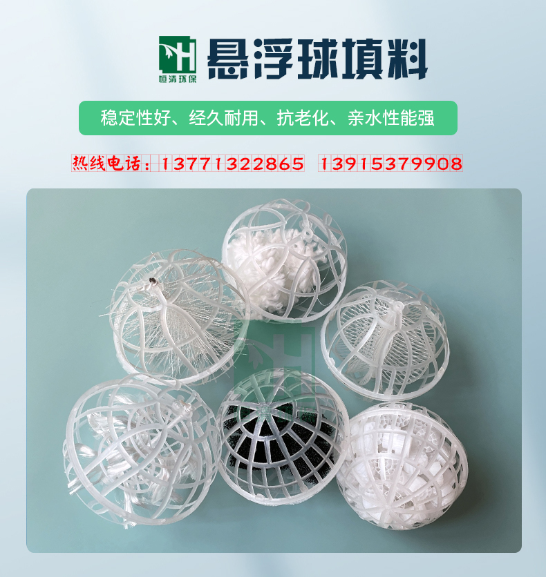 懸浮球填料由聚丙烯材料注塑而成,分內外雙層球體,外部為中空魚網狀球體,內部為旋轉球體。主要起生物膜載體的作用,同時兼有截留懸浮物的作用,具有生物附著力強、比表面積大、孔隙率高、化學和生物穩定性好、經久耐用、不溶出有害物、 不引起二次污染、防紫外線、抗老化、親水性能強等特點,在使用過程中,微生物易生成、易更換、耐酸堿、抗老化、不受水流影響、使用壽命長,剩余污泥少,安裝方便。能有效切割氣泡,提高了氧的利用率,掛膜快且多。處理效果好,是處理污水理想的新型懸浮填料。