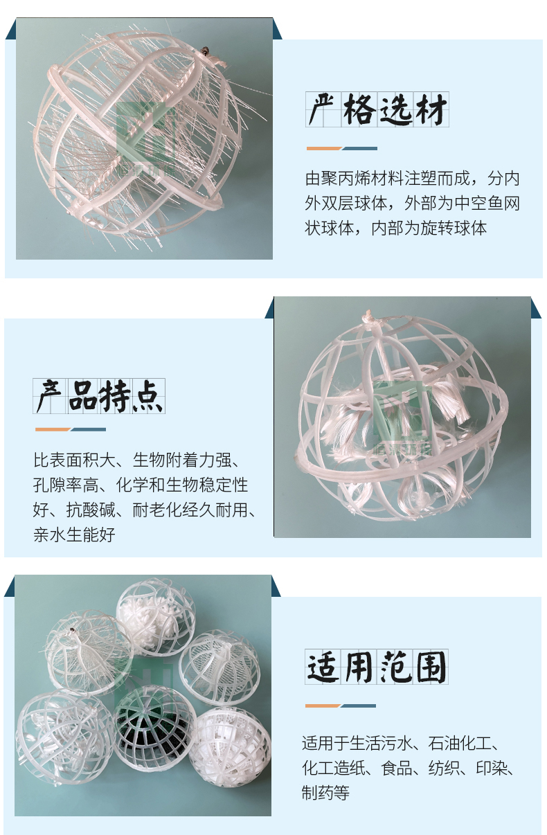 該填料系列由聚丙烯材料注塑而成,分內外雙層球體,外部為中空魚網狀球體,內部為旋轉球體。主要起生物膜載體的作用,同時兼有截留懸浮物的作用,具有生物附著力強、比表面積大、孔隙率高、化學和生物穩定性好、經久耐用、不溶出有害物、 不引起二次污染、防紫外線、抗老化、親水性能強等特點,在使用過程中,微生物易生成、易更換、耐酸堿、抗老化、不受水流影響、使用壽命長,剩余污泥少,安裝方便。