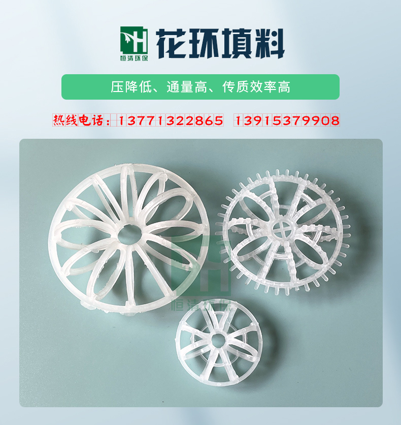 花環填料其結構是由12個小圓環按徑向排列而組成的一個大扁球體,很類似于一個螺旋形彈簧首尾相接繞成的一個圓球體。有的小圓呈A字;有的在小圓和大圓邊沿還帶有齒;有的外圍沒有大圓圈,只有里面的小圓組成,客戶可根據各自的要求訂購不同種類的花環。產品具有壓降低、通量高、傳質效率高,用戶可根據塔內使用條件(如溫度、壓力、介質等)選擇不同材質如聚丙烯(PP)、增強聚丙烯(RPP)、聚氯乙烯(PVC)、氯化聚氯乙烯(CPVC)、聚偏氟乙烯(PVDF)等塑料