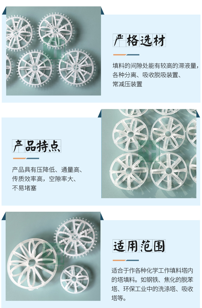 花環填料材質密度0.90-0.91g/cm3,具有優良的屈服、拉伸、 壓縮強度和硬度、彈性。耐高溫:在不受外力作用時,150℃也不變形,正常使用溫度為-30-95℃,脆化溫度為-35℃;化學穩定性:除能被濃硫酸及濃硝酸侵蝕外,對其他各種化學試劑都比較穩定。所以,聚丙烯花環填料適合于作各種化學工作填料塔內的塔填料。如鋼鐵、焦化的脫苯塔、環保工業中的洗滌塔、吸收塔等。