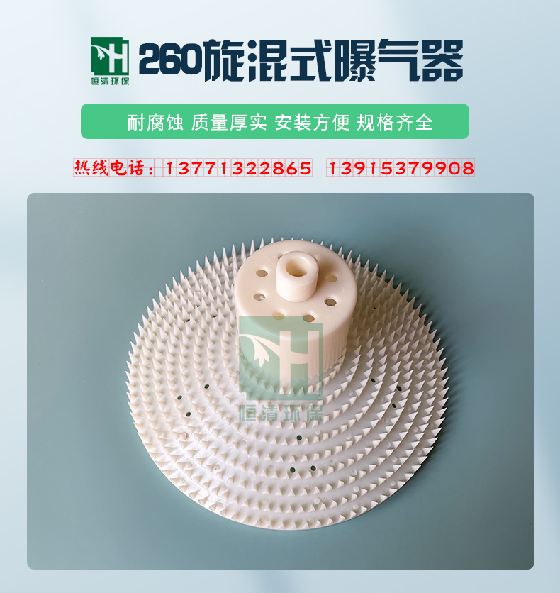 旋混曝氣器是由連接接咀,旋混芯分流圈、夾層擴散齒罩、擴散倒齒罩,空氣干管、空氣支管、水平調節支架、空氣排污裝置、等主要部件組成,空氣由配氣管道進入曝氣器,氣流會使橡膠空氣止回閥產生上下變隙運動,再通過分流圈的擴散內齒、夾層擴散齒罩上下齒、倒齒擴散罩對上浮運動的氣泡起多重碰撞破碎的動力擴散的作用。曝氣器與空氣支管的連接是采用市場上通用的標準粗螺紋連接。