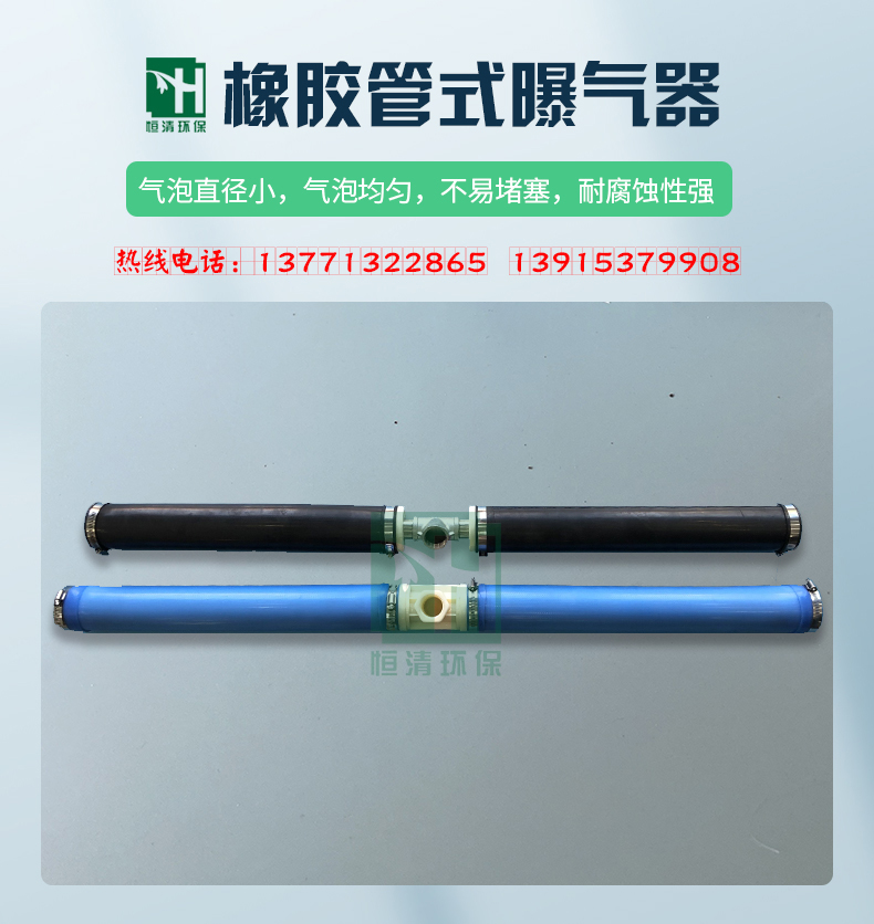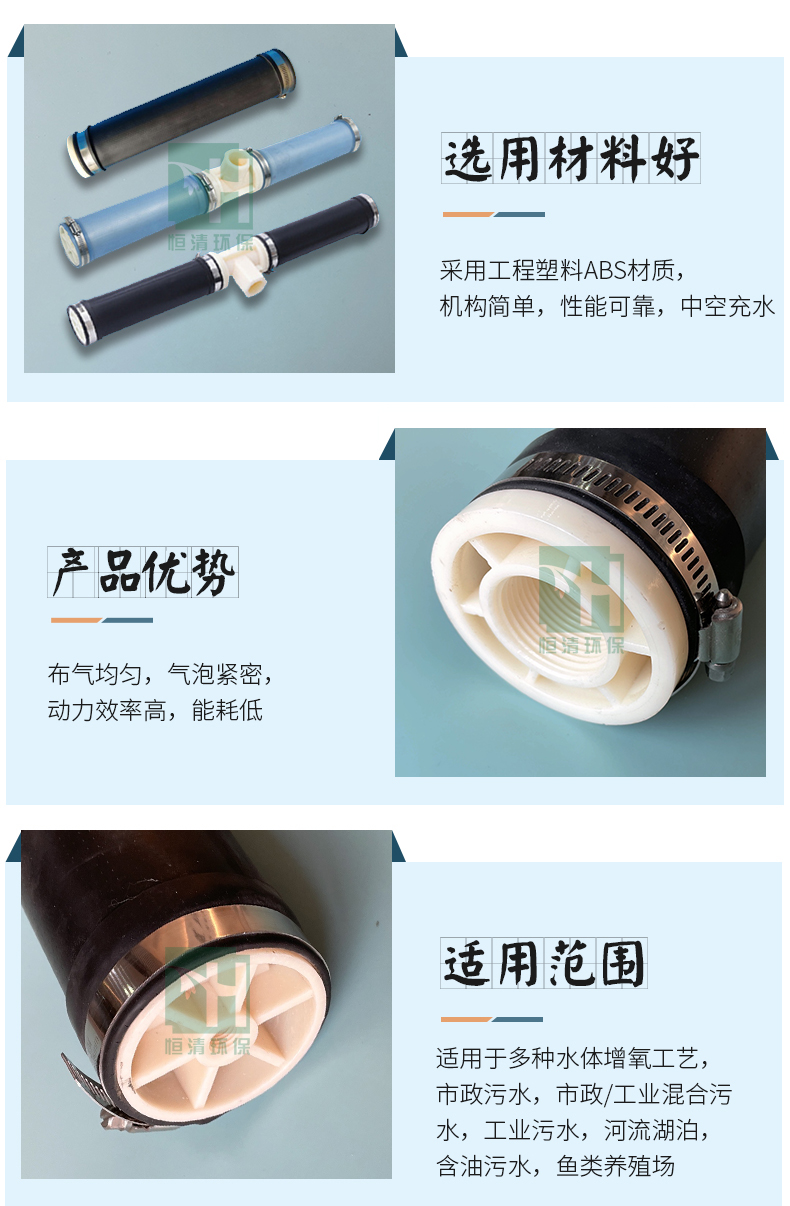 它在布滿細小氣孔的管體上覆蓋一層帶有曝氣孔的橡膠膜;由于橡膠膜具有良好的伸縮性,當氣體通過管體上的氣孔將氣壓作用在橡膠膜上時,橡膠膜上的曝氣孔膨脹掙開,使得空氣通過曝氣孔向水中均勻擴散,從而實現充氧之目的;當停氣時,橡膠膜曝氣孔處于準封閉狀態,因而氣孔不易堵塞。