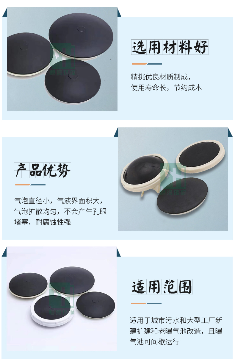 膜片式微孔曝氣器是80年代研制的新型曝氣裝置,該裝置曝氣氣泡直徑小,氣液界面積大,氣泡擴(kuò)散均勻,不會(huì)產(chǎn)生孔眼堵塞,耐腐蝕性強(qiáng),經(jīng)上海同濟(jì)大學(xué)環(huán)境工程學(xué)院和中國(guó)市政工程華北設(shè)計(jì)院進(jìn)行清水和污水充氧測(cè)試,并經(jīng)50多家用戶多年使用效果良好(比常規(guī)產(chǎn)品固定螺旋曝氣器,散流曝氣器和穿孔管曝氣器能耗降低40%,或增加污水處理量40%)。特別適用于城市污水和大型工廠新建擴(kuò)建和老曝氣池改造,且曝氣池可間歇運(yùn)行。