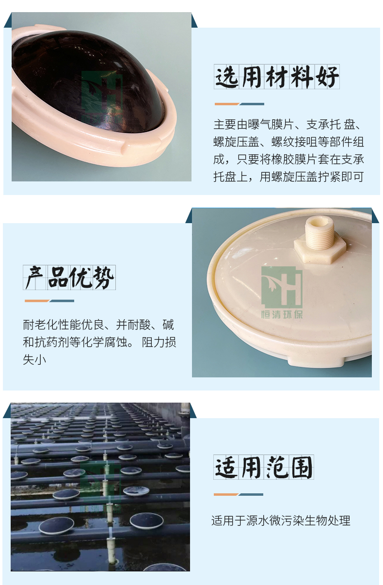 防堵、防倒灌笥好。曝氣器成球冠形,即使曝氣池水質復雜,還是 間歇運行,其表面不易積泥。膜片打孔技術好,為斜穿切口式。另外在頂部中心設立特形密封圈,更有效阻止水體倒流。膜片抗撕裂性強。橡膠膜片為球冠 形,工作時孔眼張開受力均勻,疲勞變形程度降低,回彈性好,不易撕裂,使用壽命長。 布氣均勻,節能高效,球冠形曝氣器工作表面積較平板相對增大,氣泡 小,布氣均勻,充氧效率高,處理效果好。特別是在低氣量工作時,仍能發揮這一特性,運行管理方便。 耐老化、抗腐蝕。球冠形曝氣膜片選用優質橡膠制成,支 承托盤及螺紋接咀均為工程塑料。這些材質具有優異的物理和機械性能。耐老化性能優良、并耐酸、堿和抗藥劑等化學腐蝕。 阻力損失小。由于曝氣器防 堵、防水倒流性能,省去了平板式微孔曝順附設的逆止閥,從而降低了曝氣器的阻力。節省了能耗。